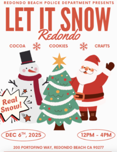 200 Portofino Way, 12-4pm – Real snow in Redondo Beach! Bring an unwrapped toy, coat, or gift card. Benefits the Domestic Violence Victim Advocacy Program.